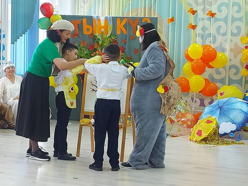 Қоян мен Кірпі балалармен бірге отты «Қолшатыр» биін билеп, күз туралы тақпақтар айтып, «Қап-қап» және «Қоқ-тық» әндерін шырқап, залды жылулық пен жайлылық атмосферасына толтырды.