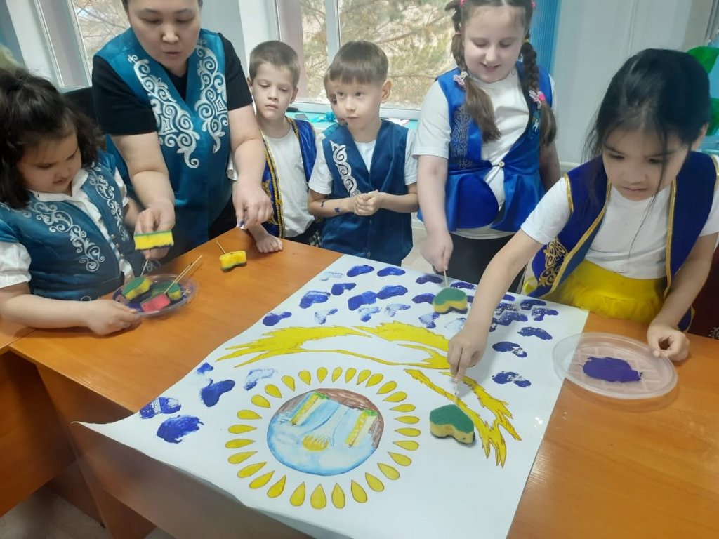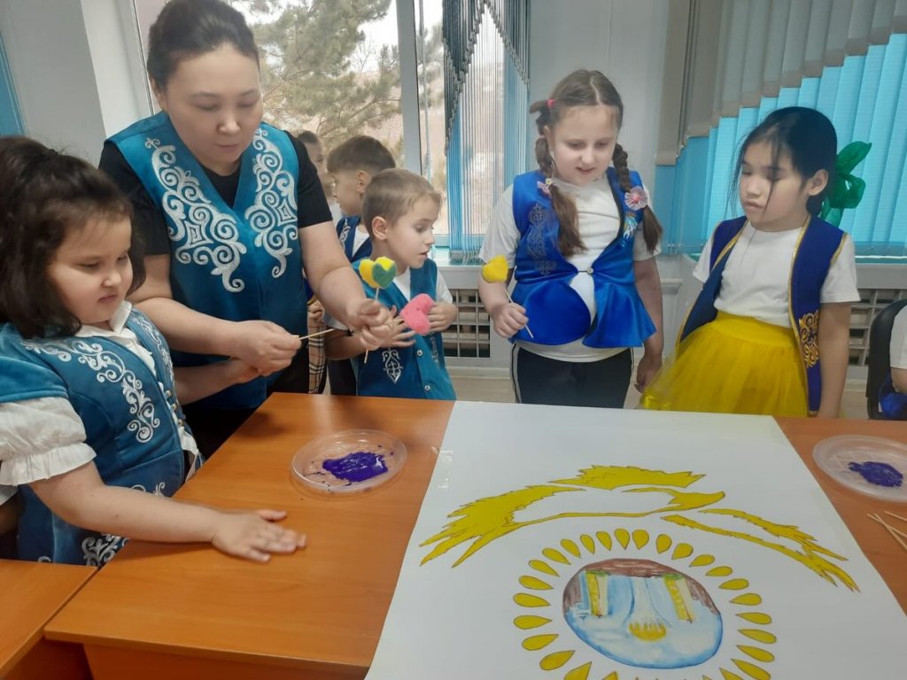 Оқушылар Тәуелсіздік рәміздерімен танысып, өз еліңнің азаматы болу дегеннің мағынасын талқылады. Одан кейін практикалық бөлім – ұжымдық шығармашылық жұмыс өтті. Балалар мерекелік плакаттарды үлкен қызығушылықпен салып, ашық түстер мен қарапайым бейнелеу элементтерін қолданды.