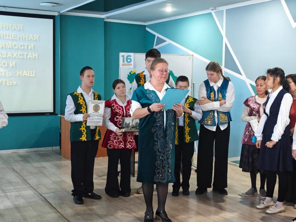 Мұғалімдер Анна Викторовна Хохлова мен Татьяна Александровна Безуглая 9B және 9G сынып оқушыларымен бірге тәуелсіз Қазақстанның тарихы – қазіргі уақытта халықаралық деңгейде тұрақты, күшті және ашық деп танылған мемлекет болудың қиын, бірақ даңқты жолы туралы әңгімеледі.