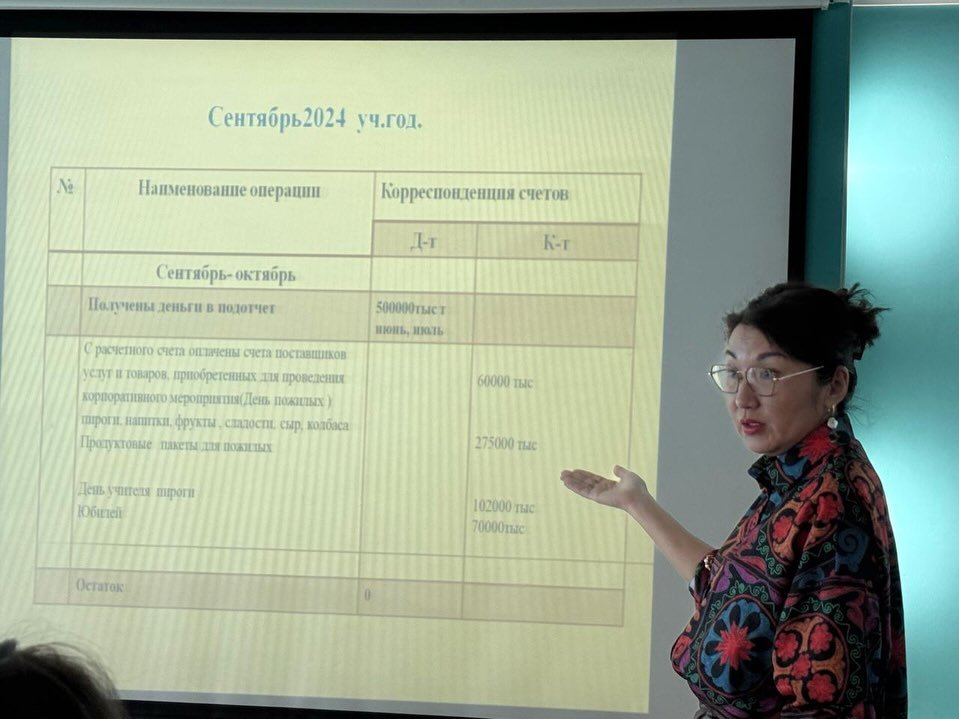 Отырыс барысында мектептің бас бухгалтері Жанна Есханқызы Төлебергенова 2024-2025 жылдарға арналған қаржылық есебін ұсынды. Баяндамасында ол жалақы, зейнетақы жарналары және қызметкерлердің жалақысынан ұсталатын табыс салығын қамтыды.