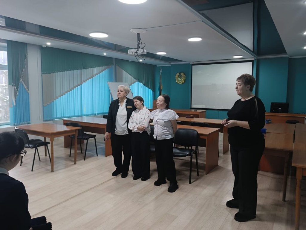 «Тігін өндірісі және киім моделін жасау» мамандығы бойынша өндірістік оқыту шеберлері Ивашкевич Ирина Александровна мен Карпунина Наталья Николаевна, сондай-ақ 2-курс студенттері- мектептің түлектері Гирёва Екатерина мен Булатова Руфия оқушылармен жүздесті.