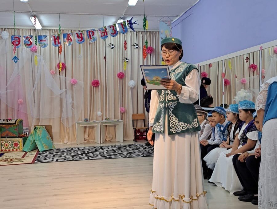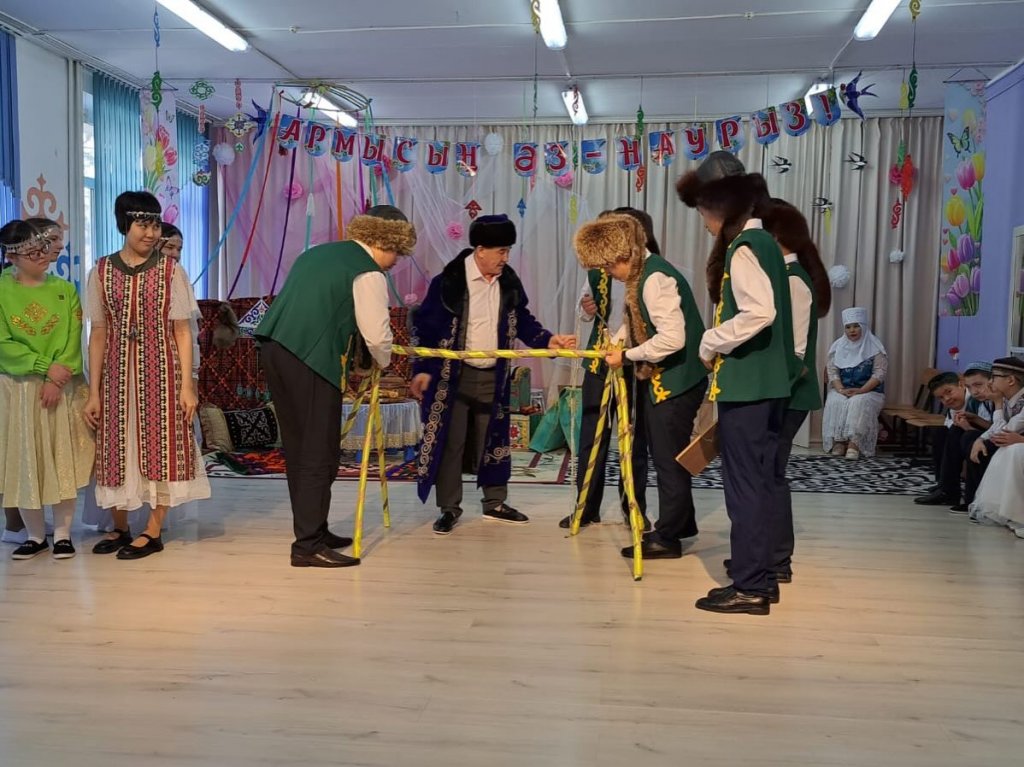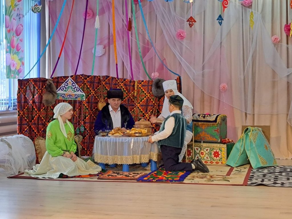 Іс-шара шағын сахналық көрініспен басталды. Киіз үй ішінде отырған Ата ( Бекмагамбетов Қ.С.), Әже( Олжабаева А.К.), Ана ( Нина) арқылы қазақ отбасының жылуы мен берекесі көрініс тапты. Әженің немересіне ( Нұрсұлтан) Наурыздың мәнін, «ұзын сары» ұғымын түсіндіруі арқылы балалар табиғаттың жаңаруы мен көктемнің келуінің маңызын ұғынды. Бұл көрініс ұлттық тәрбие мен ұрпақ сабақтастығын айқын бейнеледі.